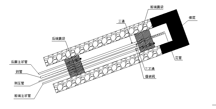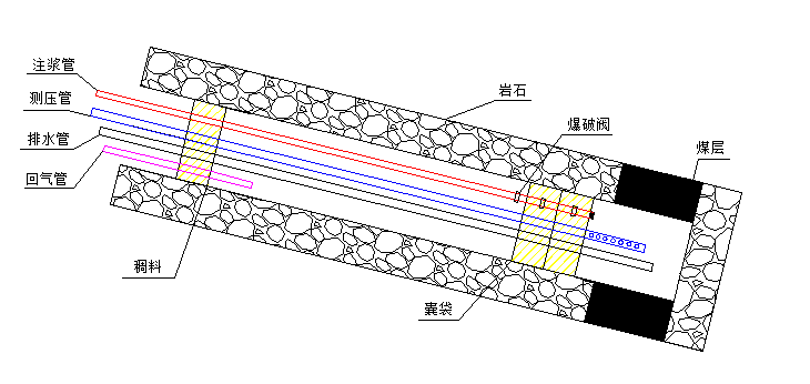 4、帶壓注漿。連接注漿泵及注漿管路,并用清水實驗泵及管路是否正常,確認正常后將封孔劑與水按照質量比1:1比例混合均勻,啟動注漿泵向孔內注漿。漿液率先注入孔底兩個囊袋內,待囊袋充起并濾水凝固后,注漿壓力達到0.6MPa左右,此時爆破閥爆破,漿液自行注入鉆孔中間密封腔,待漿液從回漿管持續(xù)返出時,關閉回漿管閥門,并繼續(xù)向孔內加壓注漿,直至注漿壓力達到1.5-2MPa時,停止注漿;