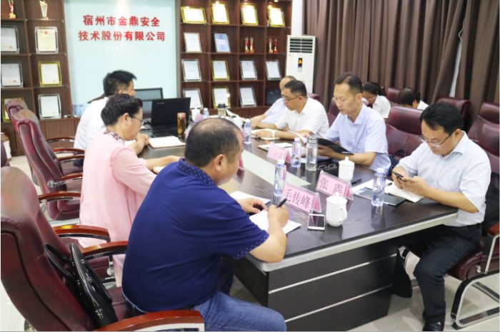 2019年8月2日下午,宿州市市委常委、副市長(zhǎng)吳繼承一行到宿州市金鼎安全技術(shù)股份有限公司(以下簡(jiǎn)稱(chēng)金鼎安全)調(diào)研企業(yè)上市工作,市地方金融監(jiān)督管理局局長(zhǎng)呂金波、調(diào)研員陳銀鴿等相關(guān)領(lǐng)導(dǎo)陪同調(diào)研。